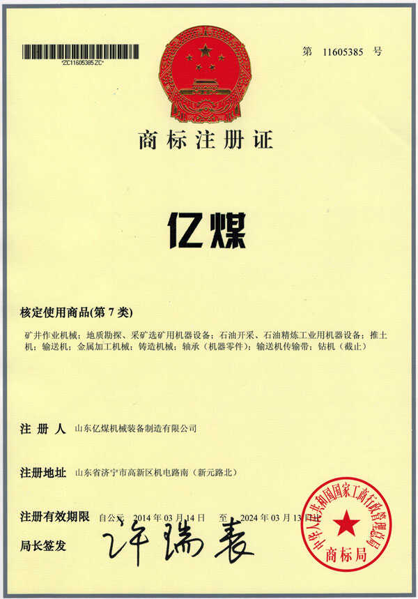 近日,山东中煤集团旗下子公司山东亿煤机械装备制造有限公司和北京亿科创想网络科技有限公司分别成功获得“亿煤”和“亿矿”商标注册证。